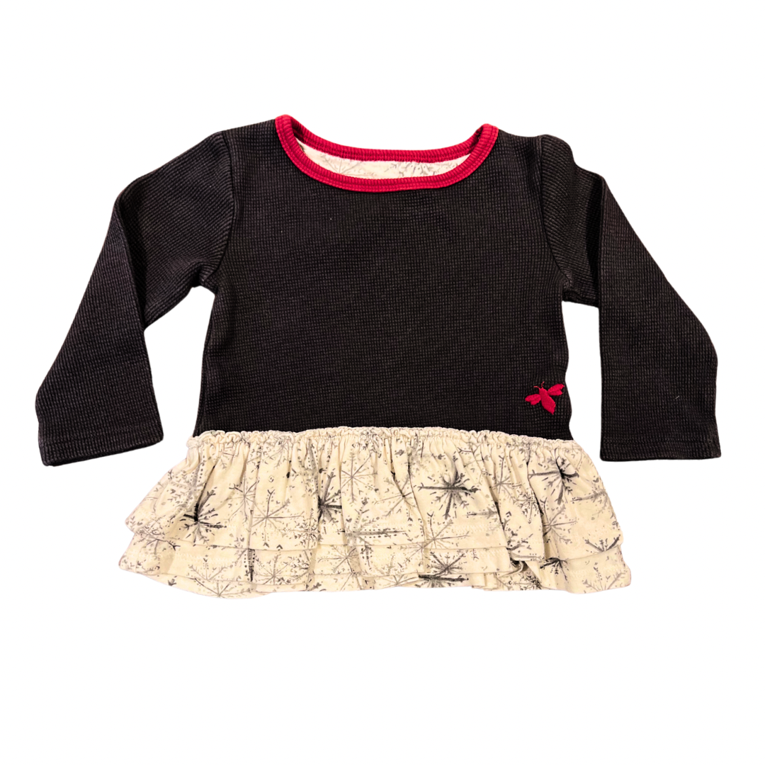 - Navy top with red lining. Ruffle part is white with grey snowflake design