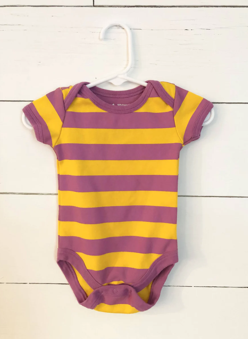 - Short sleeve onesie with yellow and pink/purple stripes